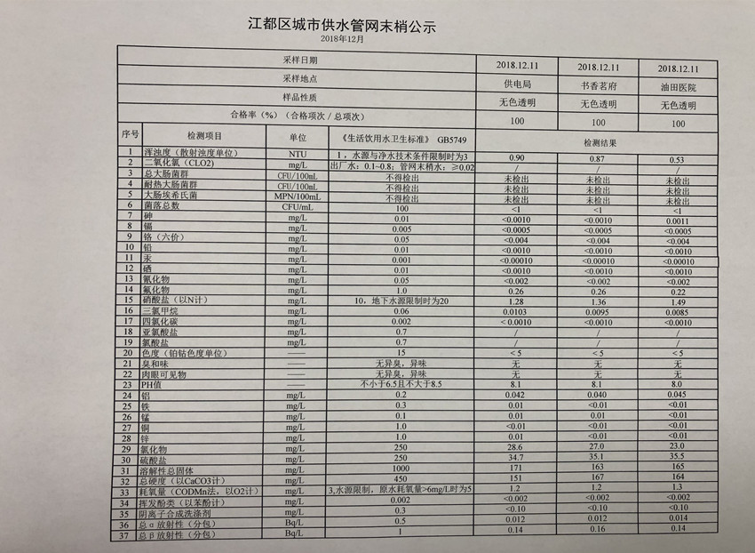 2018年12月江都區(qū)城市供水管網(wǎng)末梢公示